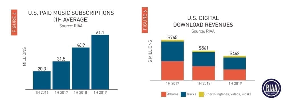The recent figures released by the RIAA clearly show a strong decline in digital downloads and a continued shift towards streaming services for digital consumption.