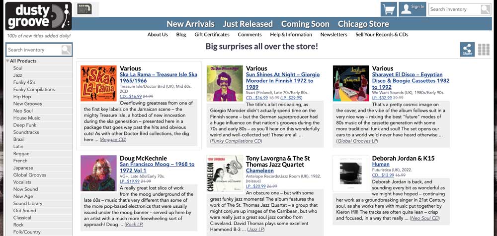 If you’re an avid collector of jazz, funk, soul, hip-hop, or world music, Dusty Groove is one of the best online record stores out there. There are hundreds of new titles added daily, with plenty of rare and collectible titles in the mix.