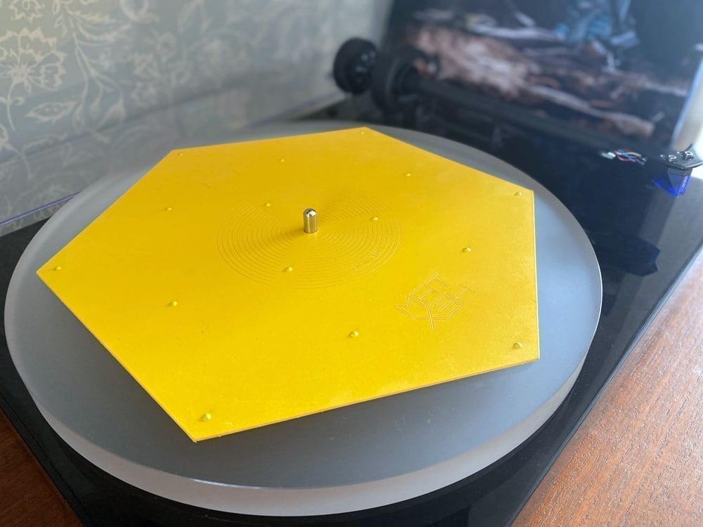 So you can see what Fajt is getting at here. It’s an interesting concept that flies in the face of convention. The product looks pretty striking too, with is bold yellow color and hexagonal shape that sports laser-etched logos and spherical cuts. The HEX mat looks pretty cool on my acrylic platter, but I think it looks particularly striking with the contrast of a black platter.