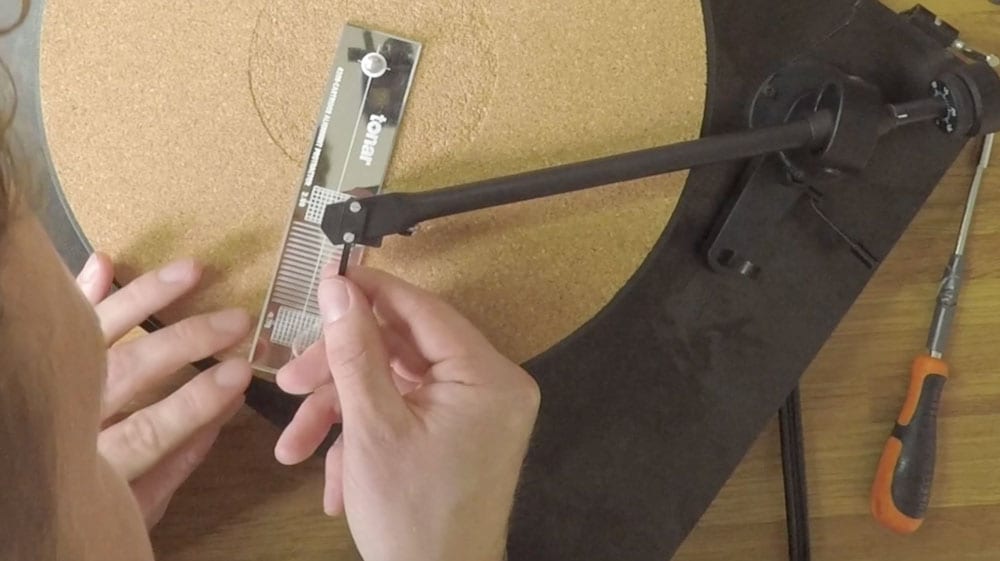 Using an alignment protractor, we need to ensure the cartridge is aligned for the best tracking performance across the surface of the record as it pivots from the beginning of the record to the run-out groove.