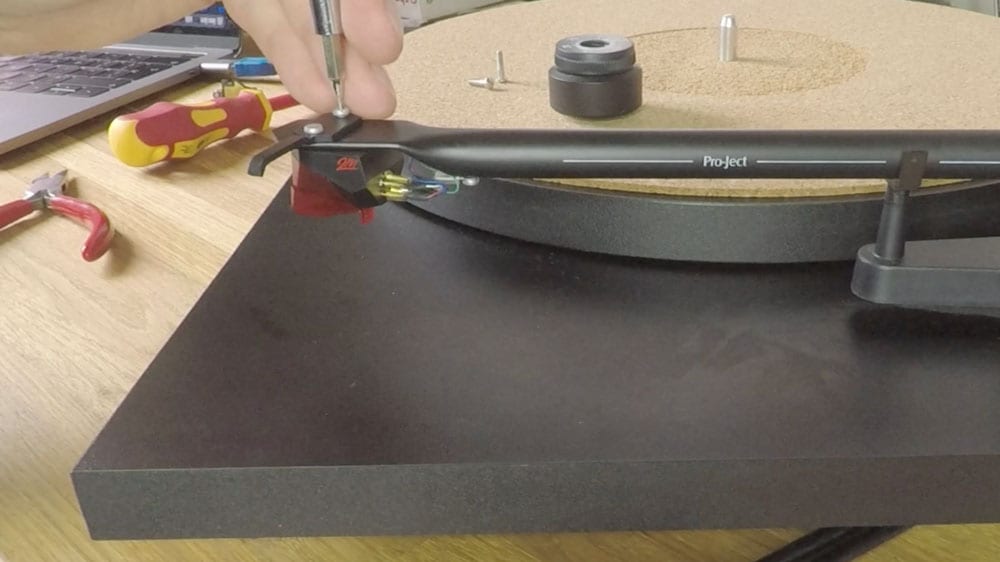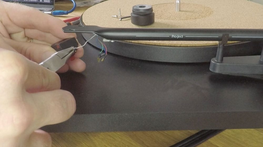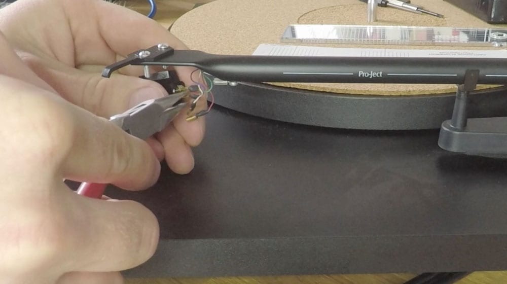 For this step, I like to remove the counter weight and preferably secure the tonearm in its resting place with a cable tie. With the stylus guard in place, gently connect the wires of your new cartridge using your longnose pliers. You’ll feel them click into place, but don’t push too hard as to risk damaging anything.