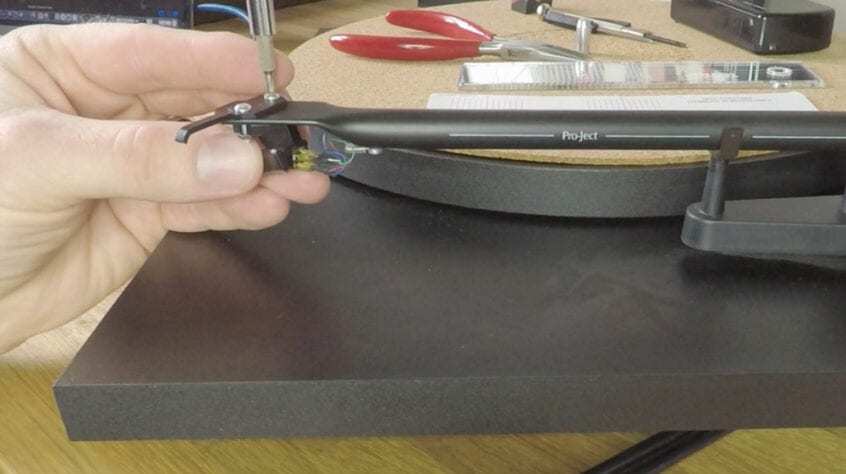 Start by unscrewing the cartridge from the headshell. (Add or drop the stylus guard if you’re keeping the existing cartridge and want to protect the stylus).