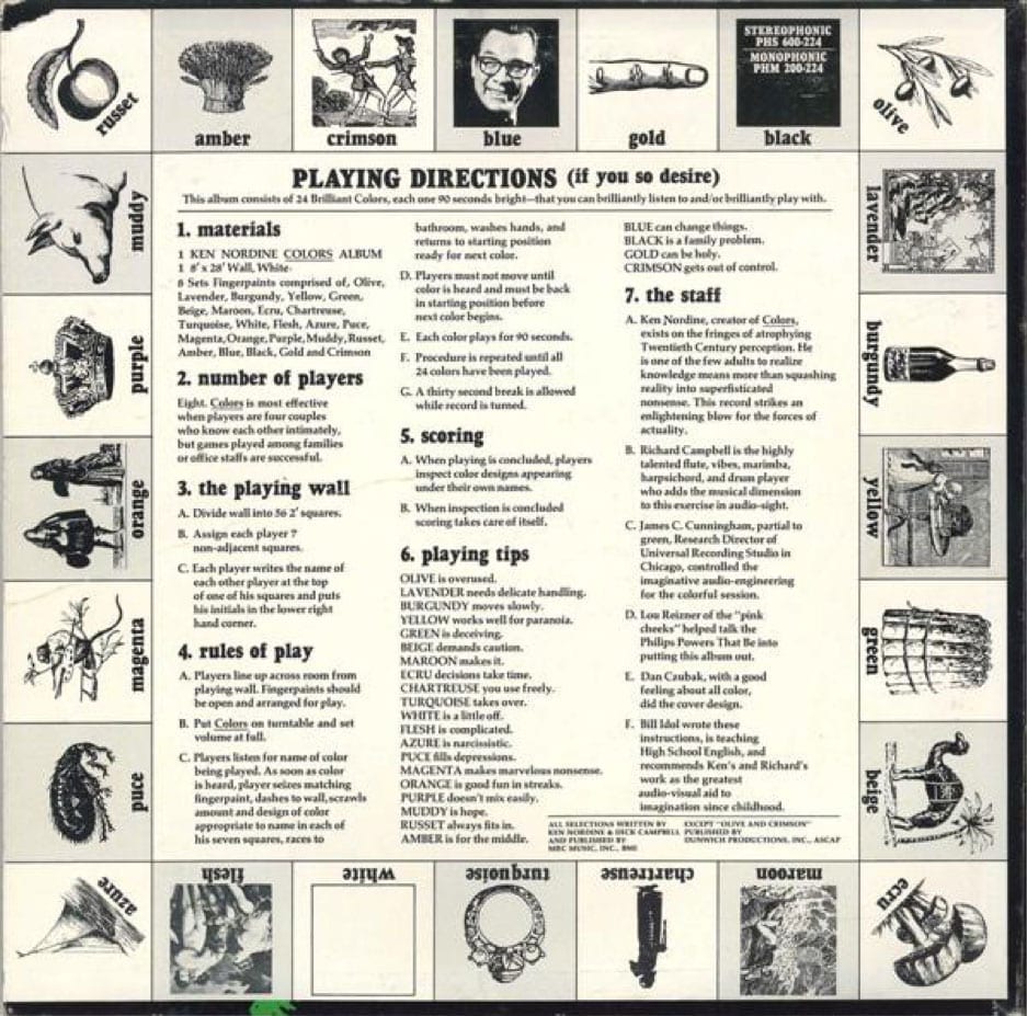 … Which leads me onto the extremely unique back cover of the jacket, which consists of an eccentric set of rules to a game that is meant for eight players to paint an entire wall (or room) of a home based on the colors personified on this record using finger paints. Seriously. Here’s a snippet: