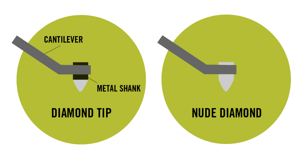 The cartridge body on both models are exactly the same; the difference lies in the stylus. The 2M Red is a standard tipped elliptical diamond stylus, whereas the 2M Blue is a nude elliptical stylus. Standard tipped designs are fastened to a metal shank. A nude stylus is a whole diamond fastened directly to the cantilever. The benefit is lower mass, which results in a more agile design that can track the groove more accurately. High-frequency transient reproduction, in particular, is said to be improved.
