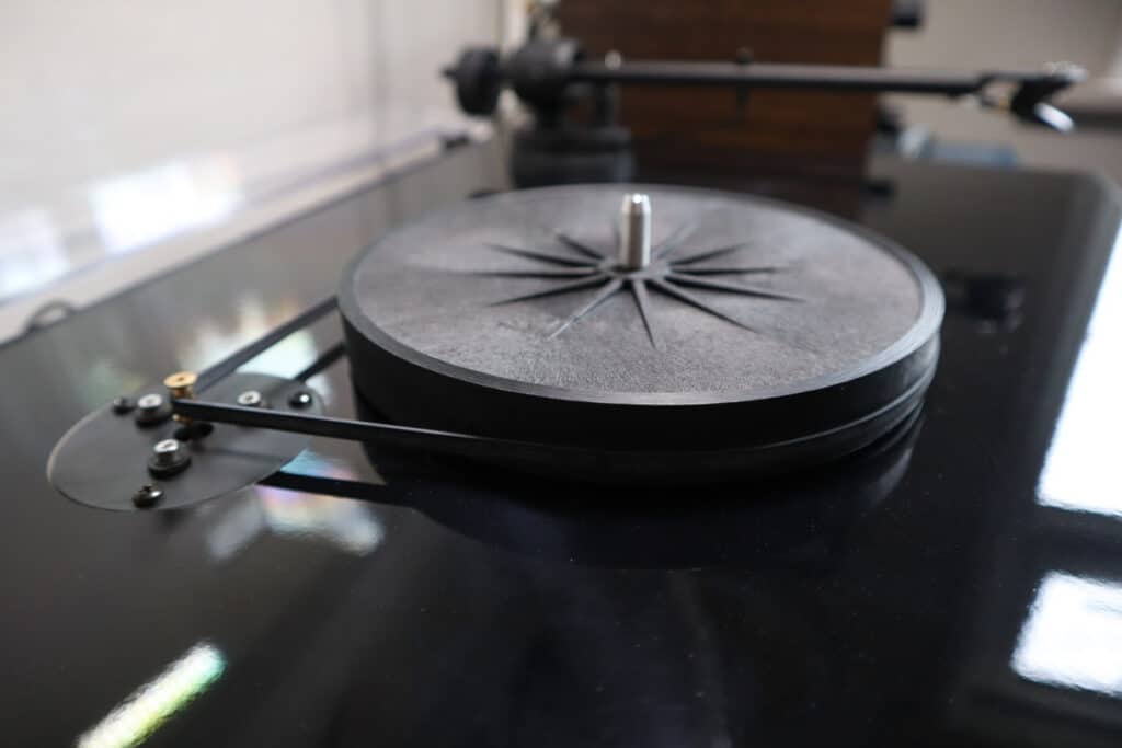 What this setup does allow within a limited budget is speed control via a pulley and motor system. The hollow platter sits on a sub-platter that is connected via a belt to the motor.