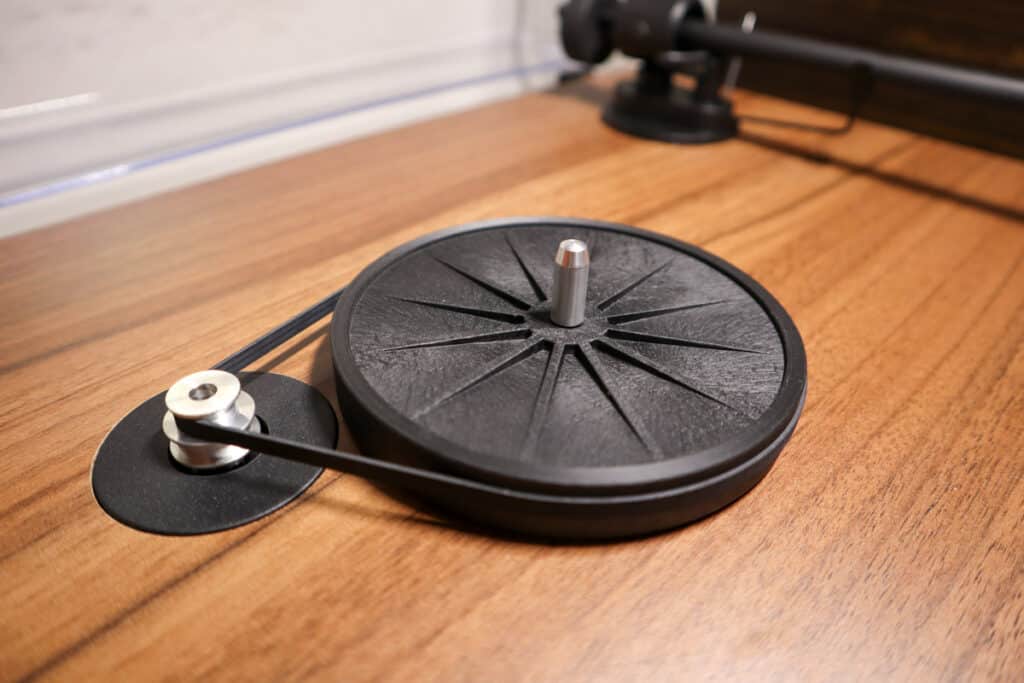 The glass platter, which has a nice weight to it, sits on top of a subplatter, which is connected to the motor via the drive belt. You’ll need to insert the sub-platter into the bearing and attach the drive belt yourself before you can spin records.