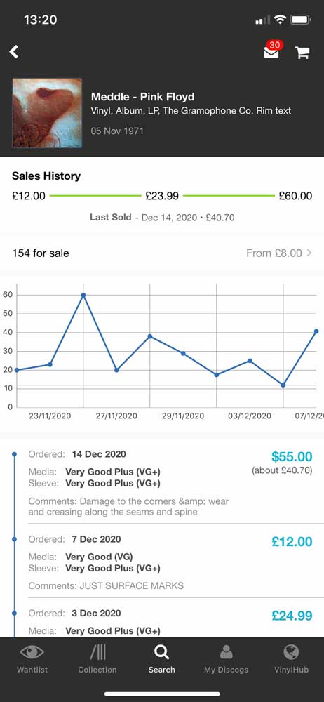 Once you’ve located the correct version, open the sales history. Here you can see the lowest and highest price a record sold for over time. You can also see a list of recent sales with condition grades to help you gain an idea of fair pricing for the copy you’re holding. Armed with this information, you’ll be able to demonstrate a fair price to the store owner using real market data. It’s worth negotiating; if you don’t ask, you don’t get.