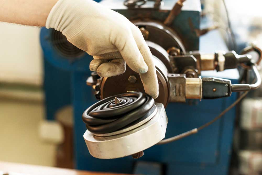 First, the master disc is placed onto the lathe and the protective strips are carefully removed. To secure the disc, the engineer places a vacuum line at the center. Next, a microscope and cutter are moved to the disc’s outer edge ready to perform a test cut. The microscope is used to assess the test groove for any issues.