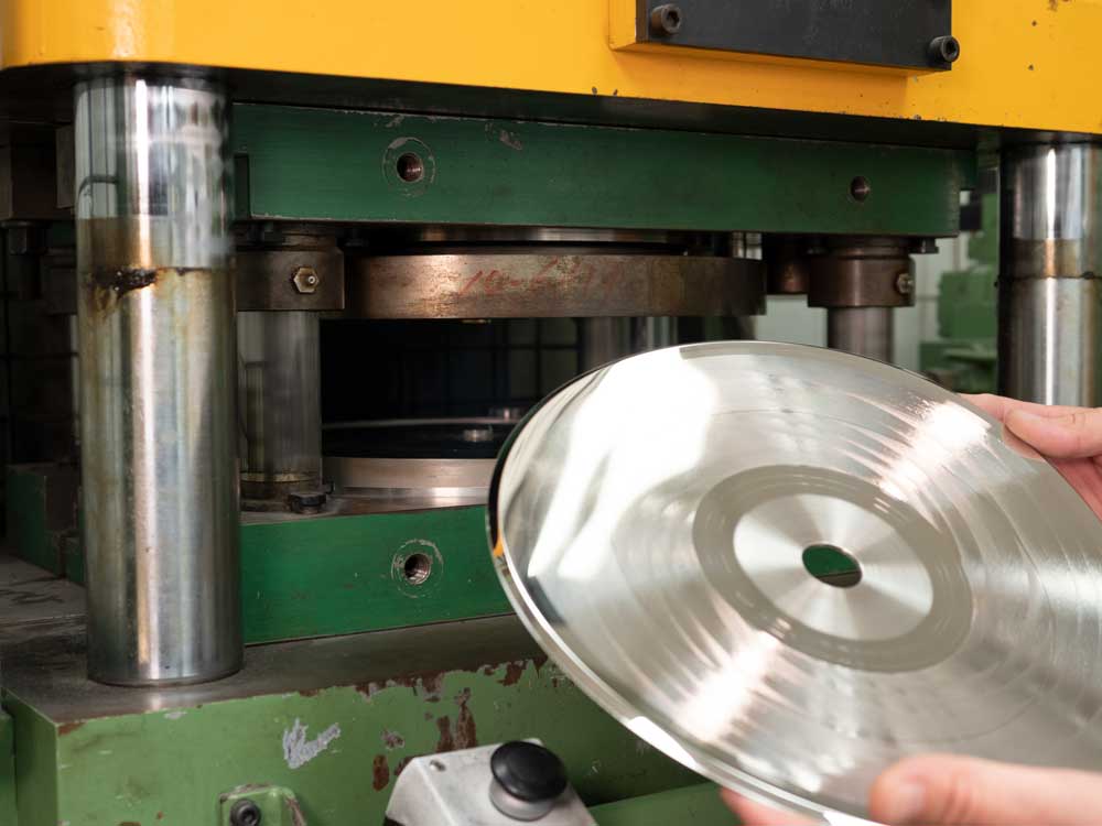 The biscuit and labels are then moved to the press where 100 tons of pressure is applied at very high temperatures to melt and mold the biscuit into a new vinyl record.