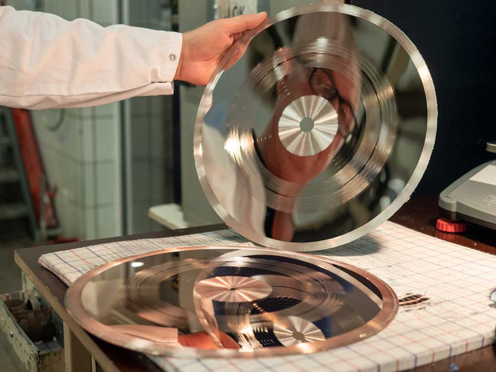 Before the discs can progress to the next stage, they must first undergo inspection for flaws. Any flaw big or small in the finish is catastrophic for the final result; therefore, the failure rate on inspection is extremely high. On passing quality control, a hole is punched into the center to complete the new master disc.